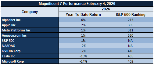 The Magnificent Seven continues to weigh on the market as a whole. Apple, Microsoft, Nvidia, Amazon, Meta, Alphabet, and Tesla have all come under pressure as earnings sensitivity, margin pressure, and AI monetization risks weigh on the sector. As a result of the significant market weight of these seven companies, the impact of the sell-off is having a material impact on the S&P 500 and the Nasdaq Composite. The continued theme of narrow leadership remains a headwind to the market as a whole.
