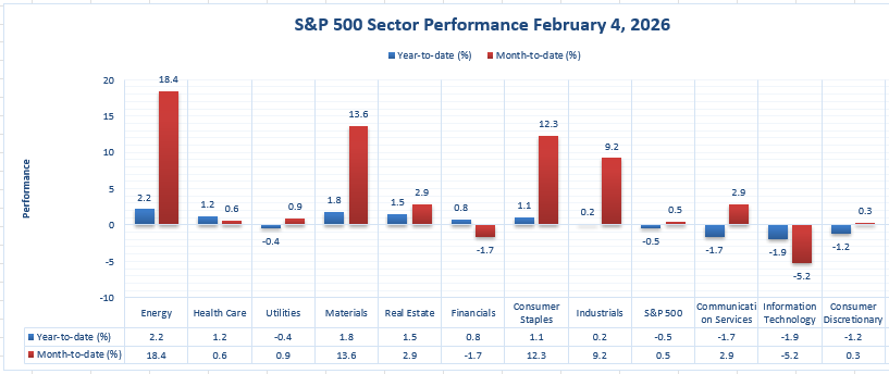 Our view at Zaye Capital Markets is that the above data show that the market’s year-to-date gains are not necessarily being driven by a rising tide but are instead being driven by specific sectors in the market’s lineup. We also believe that if Energy is able to continue its leadership, analysts should also be on the lookout to see if its daily gains are able to stay positive as they did on 2/4/2026, with a 2.2% increase, or if leadership is able to pass on to other strong-performing sectors like Materials (1.8% on 2/4/2026) and Consumer Staples (1.1% on 2/4/2026).
