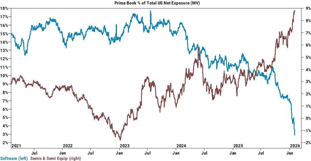 Data on institutional positions reveals a significant divergence in technology stocks, with software stocks hitting multi-year lows in technology allocations and semiconductor stocks hitting record highs. The rapidity with which these positions are changing is more than a simple risk management move; it is a repricing of where technology capital expects AI earnings to be generated. The significant selling in software has also been accompanied by extreme supply readings and record highs in trading volumes in broad software funds.