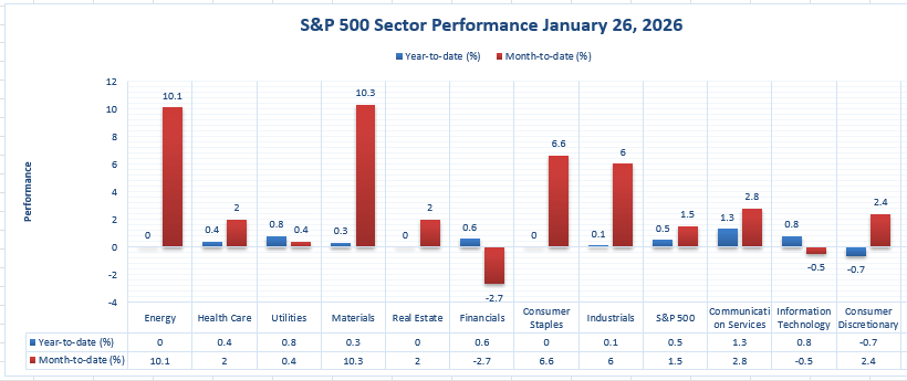 Materials leads the pack year to date with a +10.3% gain, narrowly ahead of the Energy sector, which is up +10.1% year to date. Materials also led the pack on 1/26/2026 with a +0.3% gain, a relatively modest day in the sector that suggests leadership is being built on a year-to-date basis rather than on a day-to-day basis. To our mind, this reflects the sustained investor demand for sectors that are tied to physical inputs, pricing leverage, and supply chain normalization in a world where the S&P 500 is up a mere +1.5% year to date.