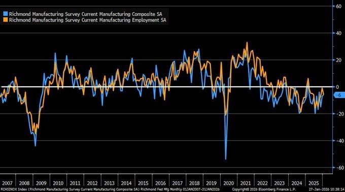 The Richmond Fed Manufacturing Index rose marginally in January, up from -7 in December, but still below the expected -5, indicating that the Fifth District factory activity is still in contraction mode. Although the increase is a positive sign, the Richmond Fed report, which polls more than 100 manufacturers, also points to the uneven nature of the recovery process. New orders and shipments have slowed the rate of decline compared to the previous month, indicating a tentative return towards normalization, but the increase is still not significant enough to indicate a change in the trend. As a regional report, the Richmond Fed is still ahead of the national data, and its January report is consistent with the 2026 theme of muted industrial activity.