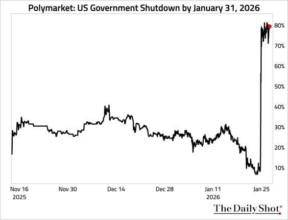 Market-based probabilities of a near-term government shutdown have increased significantly, reflecting rising budgetary and funding-related policy uncertainties. Although shutdown-related uncertainties tend to be short-lived, the repricing of probabilities is important, reflecting rising institutional caution and policy risks at a critical time in the economic cycle. Over time, even the risk of a shutdown has been known to affect market sentiment by delaying business decisions, slowing down government-related spending, and impacting volatility in rates and stocks, regardless of whether a shutdown occurs or not.