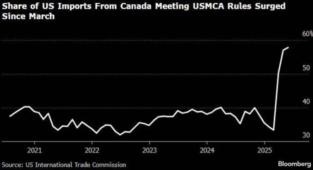 We watch at Zaye Capital Markets with interest as imports of US products from Canada surge in response to USMCA rules of origin, rising from around 40% in March 2025 to over 60% in July, per some trade commission statistics recently assembled. The sudden influx would seem of a structural nature in trade flows in North America, likely due to redoubled enforcement or tactical rebalancing of export strategies in Canada in an effort to head off impending tariffs as well as maximize USMCA advantages. Both the auto as well as agri-sectors, long associated with complicated standards of compliance, seem at the forefront of such swift rebalancing.