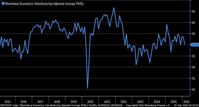 We are currently evaluating the February 2026 adjusted Philadelphia Fed Manufacturing Index, which has been adjusted to conform to broader Purchasing Manager methodologies, resulting in a print of 50.06. The adjusted index is currently hovering around the 50-level, which indicates a neutral trend, as the industrial sector is neither growing nor declining. The stabilization trend in the adjusted index since late 2025 indicates an industrial sector that has moved beyond the severe contraction phase but has yet to witness an uptick in demand growth. The raw index has shown an improvement to 16.3, rising from negative levels, but the adjusted index indicates an industrial sector in equilibrium.
