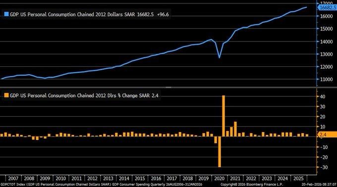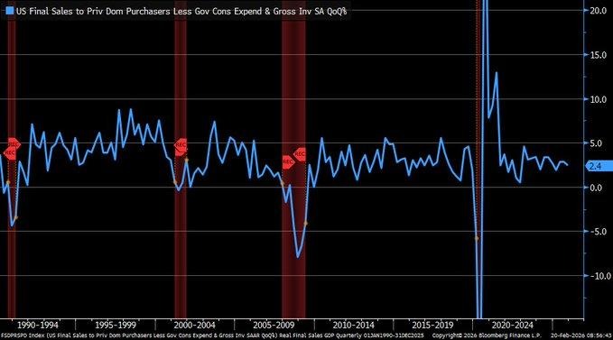 We are analyzing the Q4 2025 real final sales to private domestic purchasers, where the figure is up by 2.4% on a quarterly annualized basis. This figure excludes inventory, government spending, and exports, providing a more accurate picture of the underlying growth. Although this figure is lower than the previous period, it is still significantly higher than the historical figures that signal recessionary conditions. The data indicates that the underlying core domestic demand is still growing, even though some of the broader GDP figures are more volatile. What is more important is that this figure is a more accurate representation of the underlying revenue growth potential for the more domestically focused sectors of the economy.