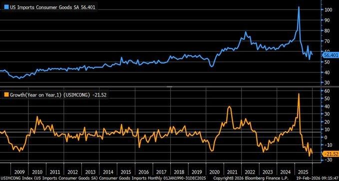 We are examining a -21.5% year-over-year fall in seasonally adjusted consumer goods imports in December 2025, the largest decline since the financial crisis period. This sharp fall in the import index from its 2022 peak of 100 to 56 indicates a significant change in trade flows. However, the cause of the fall seems to be inventory normalization, as opposed to demand shock, given the sharp fall in the import index due to the unwinding of pre-payments made in 2024 due to higher tariff rates in 2025. Average tariff rates have risen from 2.6% to 13%. Pharmaceuticals make up a large portion of the $3.5 billion fall in goods imports in December 2025.