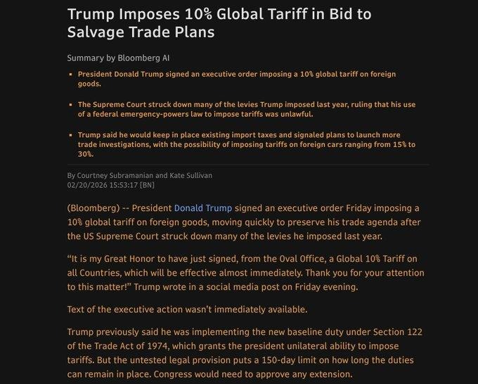 The February 20–22 period was dominated by a sharp recalibration of trade policy following the Supreme Court’s decision to strike down the administration’s broad tariff framework. In response, the President signed a proclamation imposing a temporary import surcharge and announced a new 10 percent global tariff under Section 122, later signaling that the rate could rise to 15 percent — described as the maximum under that authority. The White House framed these actions as necessary to address international payments imbalances and defend domestic industry, while also indicating additional legal paths for future tariff measures. This sequence of events introduces renewed uncertainty into global trade flows, corporate supply chains, and pricing structures, increasing volatility across equity, currency, and commodity markets as participants reassess cost pass-through dynamics and growth expectations.