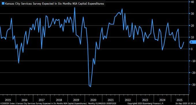 Current data from the Kansas City Fed’s September 2025 survey indicates a steady increase in the six-month capital spending (capex) forecast of service businesses, yet below the pre- and post-pandemic average. This is an indication that although a recovery trajectory is ongoing in the economy, it is cautious given that businesses remain apprehensive about supply chain interruptions on a global scale and wider market fluctuations. Since 2020, the capex forecast as a leading indicator of prospective business investment has remained muted, indicating a wait-and-see stance by businesses. This might mean that businesses are giving strategic priority to short-term survival and business stability rather than long-term business prospect development as they contend with ongoing uncertainties in the global economy.