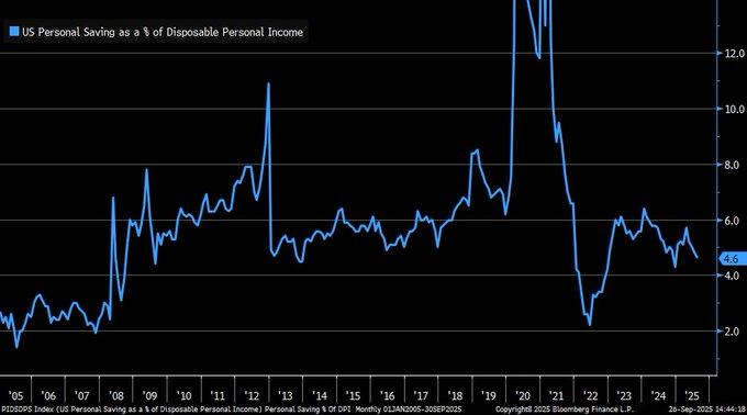 The U.S. personal savings rate dropped to 4.6% in August 2025, marking a significant decline from the peak levels observed during the 2020 pandemic when stimulus checks propelled savings to over 32%. This decline signals a shift from forced savings to increased consumer spending, which has been largely driven by persistent inflation and a normalization of economic behavior. As consumers spend more amid inflationary pressures, the savings rate continues to edge lower, reflecting an adjustment to the economic environment and the gradual reduction in pandemic-induced financial buffers. The current savings rate suggests that consumers may be prioritizing immediate consumption over long-term savings, a behavior that may be sustained as inflation remains elevated.