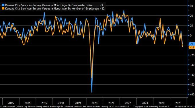 The Kansas City Fed Services Index declined to -9 in September 2025, tying its cycle low, indicating a severe contraction in services activity in the U.S., which accounts for about 70% of GDP. Importantly, the employment component of the index hit its lowest reading since 2020, implying a possible freeze in the labor market amid regional economic pressure, especially in Plains states. This major decline in services activity reflects underlying vulnerabilities in one of the largest and most important parts of the economy. This is something that analysts have to watch very closely, as this sustained contraction in services could have far-reaching consequences in terms of overall economic growth in terms of lower consumer spending as well as losses of jobs.