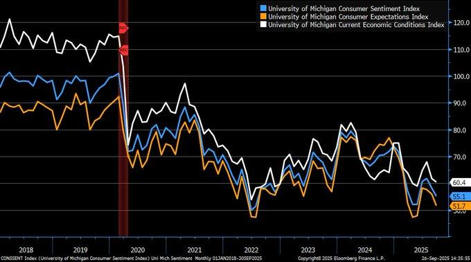 The University of Michigan Consumer Sentiment Index declined to 55.1 in September 2025 following a 5% fall from August. This is a precipitous drop spurred by growing inflation fears and softer labor market prospects, as 44% of consumers named high prices as a huge financial problem by the university’s September 15, 2025 report. This fall in sentiment is an indication of increasing consumer anxiety as people feel pricing pressure from ongoing inflation and a labor market that no longer provides as much security as it used to do. Market analysts should keep an eye on whether such shifts in sentiment are a sign of a larger move to lower consumer confidence as such patterns may foreshadow slower spending growth in the near term.