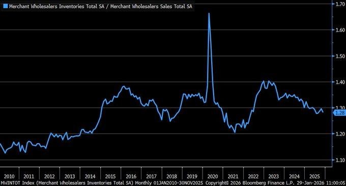 We are seeing a continued decline in the merchant wholesale inventory-to-sales ratio, falling to 1.28 late in the year and extending a steady downtrend from the post-cycle highs reached earlier in the decade. This ratio matters because it captures the balance between real demand and stock accumulation across distribution channels. A lower reading indicates that sales are absorbing inventory efficiently, reducing the risk of forced discounting or abrupt production cuts. Unlike periods where inventories swell due to demand misreads, the current pattern reflects disciplined inventory control aligned with actual sales momentum rather than speculative stocking.