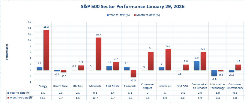 From our perspective at Zaye Capital Markets, sector-level performance shows a clear and decisive leader emerging early in the year. Based strictly on the latest S&P 500 sector data, Energy stands out as the strongest sector by a wide margin, delivering a +13.3% year-to-date gain. This performance far exceeds the broader index, which is up just +1.8% year-to-date, highlighting how concentrated returns have become. Materials follows as the second-strongest performer at +10.7% year-to-date, reinforcing the theme that capital is gravitating toward resource-linked and inflation-sensitive areas rather than broad market exposure.