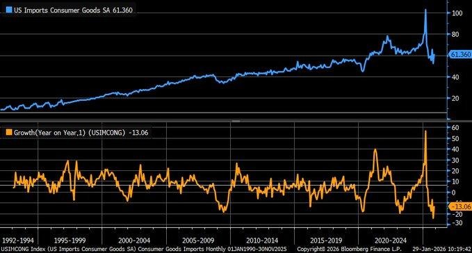 We are seeing a fragile rebound in consumer goods imports late in the year, with month-over-month growth returning after a sharp prior decline, yet the broader trend remains clearly negative. Year-over-year import volumes are still deeply lower, signaling that demand for discretionary goods has not recovered in a meaningful way. This pattern suggests households remain cautious, prioritizing essentials over big-ticket or non-essential purchases. Import data is a useful real-economy signal because it reflects actual spending behavior rather than sentiment, and the persistence of weakness points to ongoing restraint in consumer demand rather than a short-term inventory adjustment.