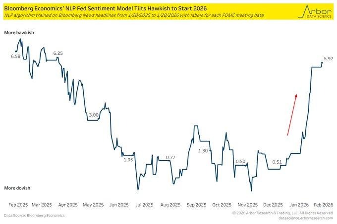 We observe a sharp shift in policy communication tone at the start of the year, with language analysis of central bank commentary signaling a return to a more restrictive stance after a notably accommodative period mid-year. The change reflects a broader recalibration in how inflation risks are being framed, moving away from confidence in sustained cooling toward caution about renewed persistence. This rhetorical adjustment matters because communication often precedes action, shaping financial conditions well before policy settings change. Markets indicate that this tonal reset has reset expectations around the speed and certainty of future easing.