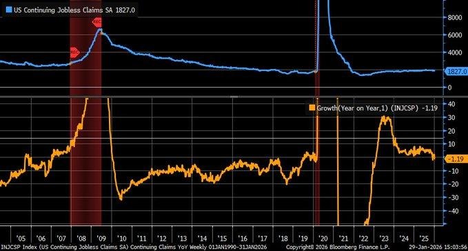 We are observing a meaningful shift in labor market dynamics, with continuing unemployment claims declining on a year-over-year basis and turning negative for the first time in several quarters. This reversal signals that fewer individuals are remaining on extended unemployment support compared with last year, marking a departure from the gradual deterioration seen throughout much of 2024 and early 2025. The trend suggests that job separations are not translating into prolonged unemployment spells, reinforcing the view that labor demand remains resilient even as broader economic conditions tighten. Importantly, this improvement reflects durability rather than overheating, as it comes alongside measured hiring rather than aggressive expansion.