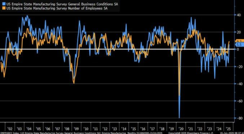 We witnessed a surprise July rise in Empire Manufacturing Index to +5.5 from a predicted -9.2, off a stunning -16 prior reading. This 22-point recovery, led by new order (+2), shipment (+11.5), and jobs (+9.2) gains, is a silver lining rare for New York manufacturing. Appreciative though the recovery is, one must treat it more like a regional oddity than a macro tipping point, least of all when juxtaposed with even larger U.S. manufacturing complex, still mired in a lagging five-year labor productivity expansion of a paltry 0.4%.