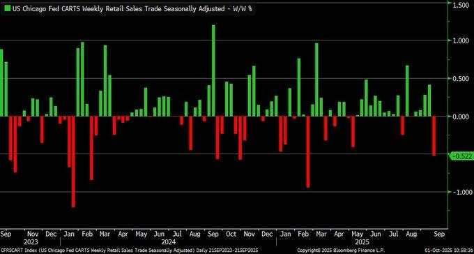 The Chicago Fed’s Advance Retail Trade Summary (CARTS) provides a real-time picture of sales at U.S. retail stores and food services as a nowcasting tool that gives a first glimpse back on consumer spending patterns. CARTS utilizes credit- and debit card transaction data to provide a preview of the official retail sales report that the U.S. Census Bureau usually reports a month later. In its advanced report released on October 1, 2025, the report indicated a decline in seasonally adjusted retail sales by a decrease of 0.52% week-over-week during the period ending on October 1. It was the largest decline since February 2025. The decline notwithstanding, it follows several positive sales increases over the preceding weeks that demonstrate consumer spending volatility on a persistent basis yet do not necessarily portend immediate cause for concern.