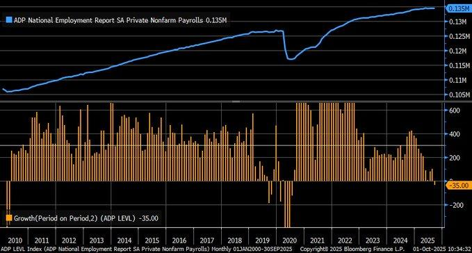 The recent ADP private nonfarm payrolls report, shared through a Bloomberg chart, reveals a concerning two-month drop of 35,000 jobs, marking the weakest performance since the 2020 recession. The September report alone saw a 32,000 job loss, reflecting a clear slowdown in hiring across key sectors such as leisure, professional services, and manufacturing. The ADP data, which is based on anonymized payrolls from over 25 million U.S. workers, offers a preliminary snapshot ahead of the official Bureau of Labor Statistics (BLS) report, providing valuable insights into the labor market’s current trajectory.