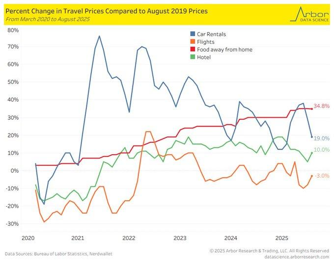 Through August 2025, travel costs have undergone significant changes, with varied trends evident across major components such as food away from home, hotels, car rentals, and airlines. Analyzing Arbor Research data with the help of BLS statistics, food away from home has increased by 34.8%, hotels by 10%, and car rentals by 19%. In contrast, flights recorded a historic decline of 3%, depicting divergent trends across the travel space. In total terms, nominal travel spending has risen by 12-14% over pre-pandemic rates as NerdWallet’s September 2025 report depicts. After the adjustment for cumulatively 26.3% CPI inflation, however, real travel spending has actually declined by 12.5%, offering a boost toward consumers’ affordability side.