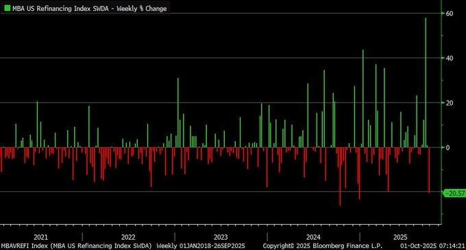 The MBA Refinancing index for the week that ended September 26, 2025, saw a drastic decline of 20.6%, its largest decline this year. The decline due to increasing volatility in the mortgage rates mirrors a larger trend in the housing market. The weekly percentage change chart since 2021 vividly shows this recent decline against the backdrop of previous periods of increase, particularly against the backdrop of the low-rate period in 2021. The prevailing 30-year mortgage rate of around 6.8% thus seems to be causing this decline, showing a highly sensitive housing market coupled with lower refinancing activity.