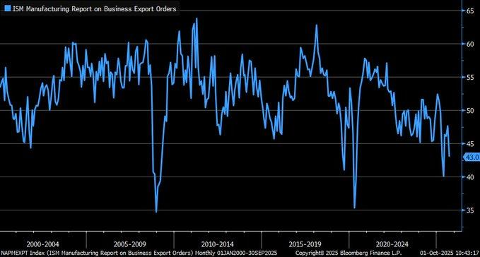 In September 2025, the new export orders index for the ISM Manufacturing PMI fell sharply to 43, a decline of 4.6 points since August. This pullback in overseas demand as reflected in the attached Bloomberg chart covering the period 2004–2025 portends increasing woes for U.S. producers. It’s one of the lower index readings since the recession of 2008–2009 when it dipped as far as nearly 35, highlighting how dire the marketplace currently is. The overall PMI composite reading as 49.1 stays below the pivotal threshold of 50, a sign that manufacturing business was still contracting. These statistics indicate a deceleration in cross-border trade coupled with the risk of tariffs and softening mainstay business in such markets as China as well as Europe.