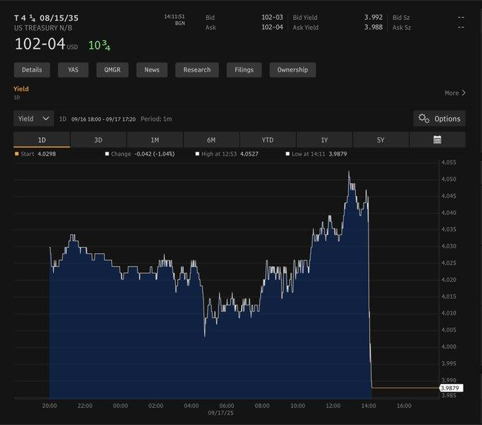We at Zaye Capital Markets point out that the 10-year US Treasury yield dropped below 4% on September 17, 2025, straight after the Federal Reserve reduced its benchmark by 25 basis points to 4.00%–4.25%. The yield shift was due to investors anxious over weakening labour market data released during the first part of the month and supported forecasts that another easing is coming. The response is the opposite of September 2024, when the yield increased following a cut, and it highlights how sentiment is now shifting to price in risks of economic slowdown over inflation fears.