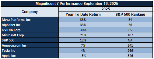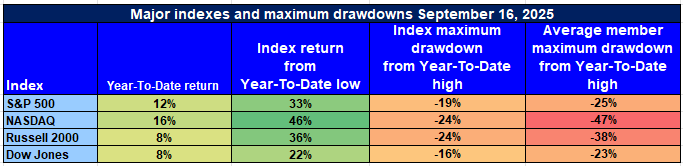 YTD: +8% | -22% below April low | -16% below YTD high | Avg. member: -23% The Dow Jones has managed to combine steady gains with more modest volatility, rising 8% in 2025 and 22% from April lows. Its composition—weighted toward industrial, healthcare, and defensive value names—has offered a measure of stability. With a smaller drawdown of 16% from its high and average member losses of 23%, the Dow reflects a comparatively safer haven within U.S. equities. Yet even here, member-level weakness persists, showing that no index has been immune to the stresses shaping global markets this year.