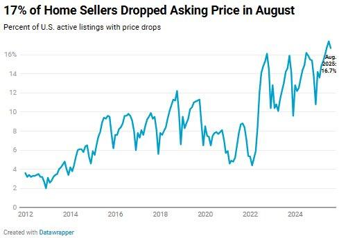 New data indicates a significant slowdown in the U.S. residential market, with 16.7% of home marketers cutting asking prices in August 2025—the highest level in August since 2012. This increase, measured in accordance with nationwide list trends, constituted a distinct year-over-year rise from 15.9% and was yet another indication of the building pressure from high mortgage rates staying above 6.5%. As median household prices continued to remain at historic levels at $439,000, the number of price cuts is an indication of rising resistance from consumers, particularly in suburban and second-tier metro markets.