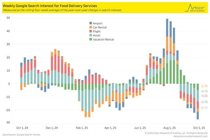Significant declines in U.S. Google search behavior for travel-related services mark ebbing discretionary demand. Search for “hotel” declined -5.75% year-over-year in early October 2025, the lowest annual rate in more than one year, says recent trend data. Wider segments such as flights and holiday rentals have also gone negative following their mid-2025 highs of more than +40%. Typically, these digital intent indicators precede actual booking trends, and the indicators do suggest the possibility of cooling in spending on travel as we approach the end quarter of the year.