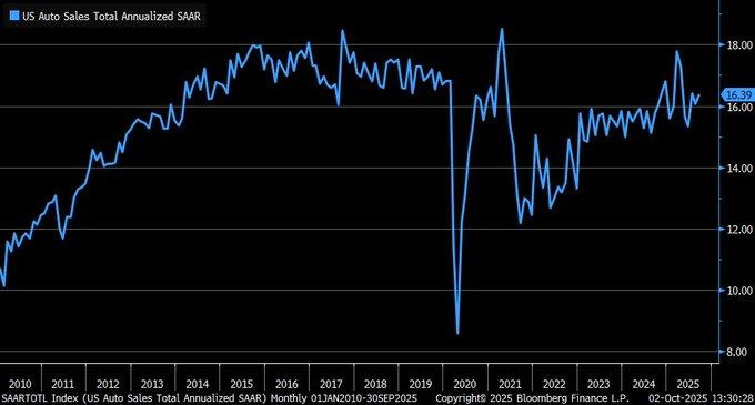 U.S. auto sales reached a seasonally adjusted annual rate (SAAR) of 16.39 million units in September 2025, up from 16.07 million in August, reflecting strong momentum in consumer demand. According to industry data, Q3 posted a 5.2% year-over-year increase, aided by competitive financing, stable inventories, and pre-policy deadline buying activity. This cyclical strength, rising off 2024 lows, suggests a supportive contribution to Q3 GDP and reflects broader post-pandemic normalization in durable goods consumption.