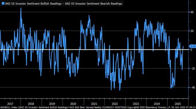 The AAII Investor Sentiment Survey’s bull-bear spread rose modestly to +3.7% for the week ending October 1, 2025, marking a slight uptick in retail investor optimism. While not excessive, this mild positive reading suggests that individual investors are cautiously constructive on the six-month equity outlook, without tipping into euphoric territory. The AAII survey has long served as a contrarian tool, with historical extremes above +30% or below -30% often preceding trend reversals in broad equity benchmarks.