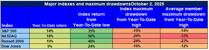 U.S. equity indexes have provided stout returns since the Apr 8, 2025 low, but a closer examination finds that average member drawdowns are stil large—hinting at thin leadership and residual volatility beneath the surface. While headline performance depicts a portrait of resiliency, breadth and internal strength remain spotty across large-cap indexes.