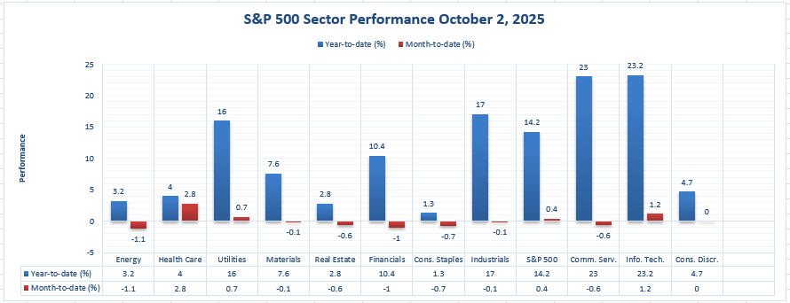 The year-to-date performance of the S&P 500 up to October 2, 2025, is one of general strength, yet there have been two clear outperforming sectors: Communication Services and Information Technology. As some defense industries have picked up pace, leadership is still centralized at the upper echelons of the market, areas related to AI, cloud infrastructure, and online platforms.