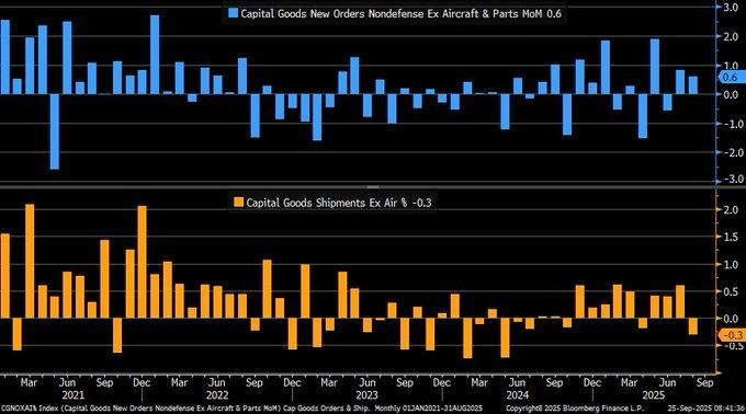 August data for 2025 recorded a rise of 0.6% of core capital goods orders (excluding aircraft and defense) that outstripped market predictions of stable growth and indicated continued demand for business equipment. Shipments fell by 0.3% versus predictions of a moderate pick-up, however, as an indication of delays towards ordering that is converted into realized investment. That gap indicates businesses are committing towards spending over the longer term but that its fulfillment is slow, perhaps an indication of logistical strains as well as financing limitations.