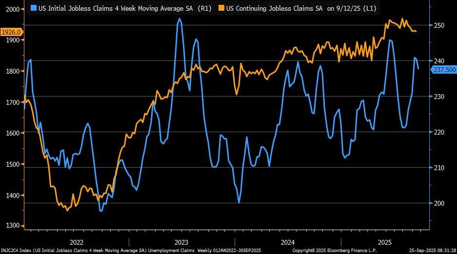 U.S. initial jobless claims fell to 218,000 for the week of September 19, 2025, below the forecast of 233,000 and from the previous week’s 232,000, while the four-week moving average declined to 238,000 from 240,000. This consistent downtrend is evidence of a labor market that persists despite wider macroeconomic headwinds. Although growth has slowed in selected areas, companies continue not to reduce their manpower bases despite the challenge of rehiring when business picks up again plus recurring needs for manpower-intensive services. These factors confirm that the employment environment remains the largest stabilizer of the economy, absorbing the shock of household spending power despite continued high borrowing costs.