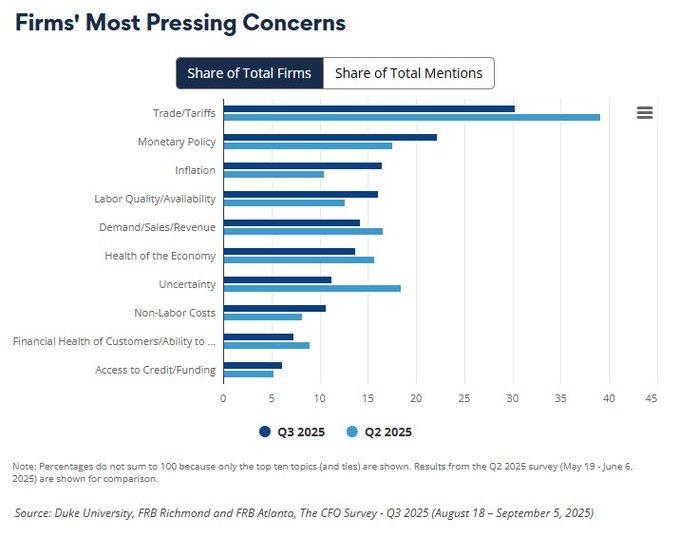 The Q2 2025 CFO Survey, commissioned by Duke University, the Richmond Fed, and the Atlanta Fed together, identifies a significant shift in corporate priorities. Uncertainty related to tariffs that was prominent across headlines in earlier years dropped from 40% of references to 30%, marking increased focus on something other than trade policy as tensions dissipated. In its stead, uncertainty and monetary policy worries increased sharply, echoing the strains from a reported September 25, 2025 GDP growth rate of 3.8% and an acknowledgment that higher prices are chipping away at confidence in forecast-based planning. The shift highlights just how companies are adjusting their risk footing at a time when trade tensions are no longer the only impetus for volatility—price stability and rate policy are stepping into the spotlight.