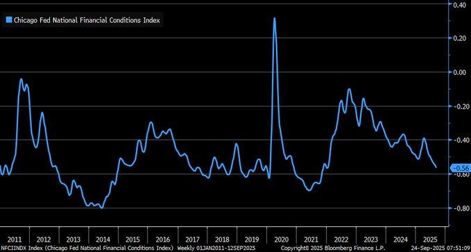 The Chicago Fed National Financial Conditions Index (NFCI) relaxed to -0.54 in late September 2025, its loosest reading since early 2022. The dramatic decrease, backed by recent cuts by the Federal Reserve, is indicative of a significant shift towards market liquidity and credit conditions. Negative values of the NFCI over history have pointed towards accommodative financial conditions, often aligned with stronger equity market performances and easy borrowing. Positive values on the other hand often precede stress-tightening signals that were present around the crisis of 2008. The present shift thus indicates an interesting deviation from recession risk indicators, consistent with market sentiment of strength despite global uncertainty.