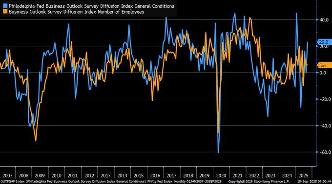 We at Zaye Capital Markets observe that the September 2025 Business Outlook Survey of the Philadelphia Fed revealed a sudden pick-up in factory activity with the main index jumping to +23.2 and employment up to +5.6, significantly above projections of +1.7. The bounce back is characteristic of the sector’s resilience and is consistent with longer-term research findings pointing to the capacity of manufacturing to bounce back once demand is stabilized. The pick-up in hiring further suggests working conditions in the industrial economy are tighter than headline jobless claims data are indicating and might provide a near-term cushioning factor to concerns about broader economic slowdown threats.