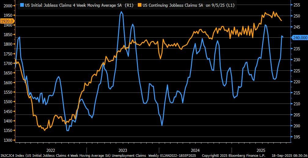 We at Zaye Capital Markets observe initial jobless claims dipped to 231,000 during the week ending September 12, 2025, and below the 240,000 consensus and previous week’s 264,000 as well. The 4-week moving average now reads 240,000, indicating stability at the labour front while the Federal Reserve recently reduced its policy rate range to 4.00%–4.25%. Continuing claims slipped by a notch to 1.920 million, a touch below expectations, indicating less long-term unemployed and furthering expectations of labour conditions being sturdier than anticipated.