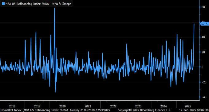 Our read is that this refinancing surge is taking place amidst the rare environment of mildly higher refinancing rates, with 30-year fixed mortgages increasing 10 basis points to 6.75% through September 15, 2025. This scenario suggests many borrowers are rushing to secure terms out of fears of rate pressure once again, and not out of a response to lower cost of funds. This is a sign of increased policy sensibility and challenges the narrative that the housing market is gaining stability. Refinancing demand being sustained would further put lenders at risk for strain to deal with pipeline capacity and funding spread.