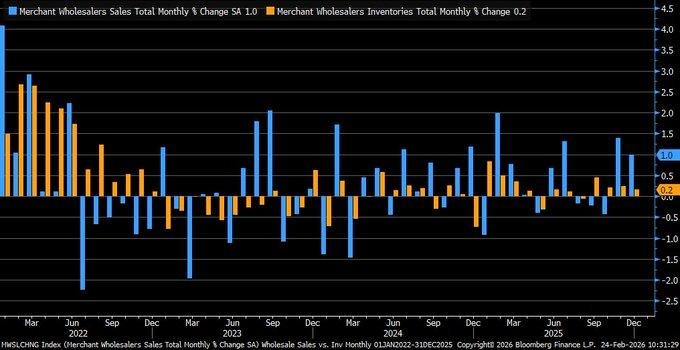 Wholesale inventories increased by 0.2% in December 2025 compared to the prior month, with sales growing by 1.0%. The sales growth has slowed down compared to the prior month’s 1.4%. The steady rise in wholesale inventories and the slowing down of sales growth are likely to result in a gradual increase in the inventory to sales ratio. When sales are growing at a much faster pace than inventory accumulation, the supply chain is operating at an optimal level. This would result in fewer discount-driven disinflationary pressures. On the other hand, the relatively lean inventory buffers would make the economy more prone to unexpected changes in sales trends, especially in cyclical products.