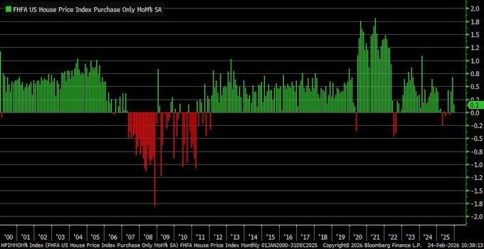The FHFA House Price Index for December 2025 increased by merely 0.1%, which is below the expected increase of 0.3%. This increase is also slower than November’s rise of 0.7%. Although this represents an all-time high for this data set at 440.4, this also shows that the pace at which this appreciation is occurring is slowing down, with quarterly increases slowing to 0.8%. This reinforces that notion that higher mortgage rates are slowing down rather than causing prices to fall. The long-term trend for this data set shows that, after an extended period of strong appreciation, this appreciation is gradually slowing down, particularly after 2022.