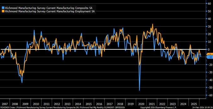 The February 2026 Richmond Fed Manufacturing Index fell to -10, missing forecasts of -5 and declining from January’s -6. The contraction accelerated across key components, with new orders falling to -9 from -6 and shipments declining sharply to -13 from -5. The acceleration of the decline in the Fifth Federal Reserve District’s main components signals that production’s positive trend is losing steam instead of stabilizing. Historically, such a decline in the regional Fed surveys has been followed by a decline in the U.S. national surveys one to two months later. The data confirms the assumption that the production sector is still struggling with weak demand and increasingly tight financial conditions.