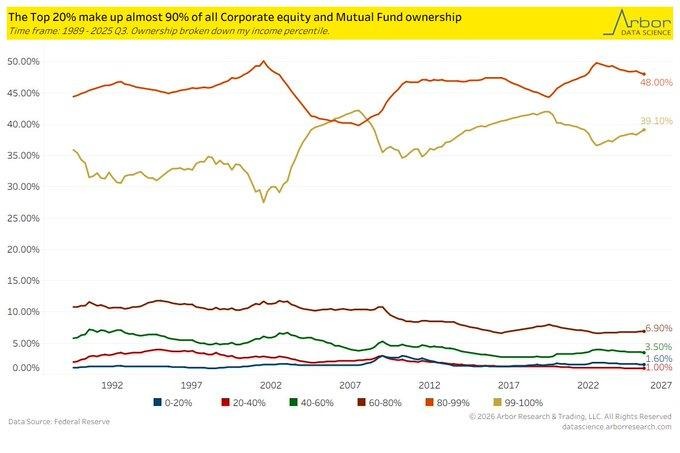 The latest data released by the Federal Reserve indicates that the top 20% of income earners owned 89.7% of corporate equities and mutual fund shares during Q3 2025, while the top 1% owned 39.1%. This represents an increase from around 82% concentration levels recorded in 1989, emphasizing the change that has occurred over the past few decades. The income brackets below this level collectively own fewer than 2% of equities, emphasizing the widening gap. From a macro perspective, this concentration increases dependency on the “wealth effect” on the performance of equities, focusing on a small segment of consumers rather than the entire population.