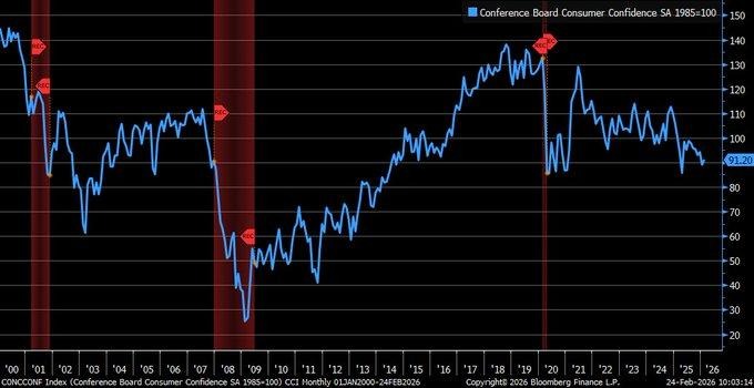 The Consumer Confidence Index increased by 2.2 points to 91.2 in February, beating expectations of 87.1 and rising from the revised January figure of 89.0. The increase was largely driven by the Expectations Index, which jumped 4.8 points to 72.0, indicating that consumers are less pessimistic about future business conditions and income growth. Conversely, the Present Situation Index fell by 1.8 points to 120.0, indicating that households believe labor and business conditions are weakening.