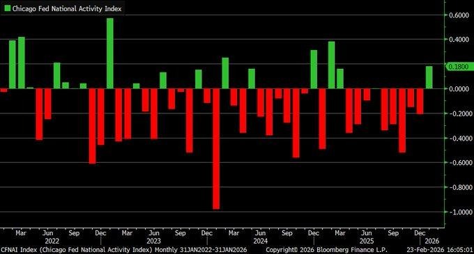 The Chicago Fed National Activity Index rose to +0.18 in January 2026 from -0.21 in December, ending five consecutive months of contractionary readings. As a composite measure built from 85 economic indicators, a reading above zero signals above-trend growth. The rebound was primarily driven by improvements in production (+0.19) and employment (+0.01), indicating that industrial activity and labor conditions contributed positively to overall momentum. While this shift suggests stabilization after late-2025 softness, the three-month moving average remains slightly negative at -0.06, underscoring that the recovery is still in its early stages rather than firmly established.