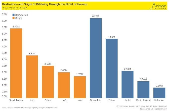 The significance of the Strait of Hormuz to the global energy landscape is underscored by the energy flow statistics. In 2025, Saudi Arabia exported around 5.4 million barrels of crude oil daily through the Strait of Hormuz, which accounted for almost 40% of the total volume passing through the strait. China alone imported around 4.6 million barrels of crude daily through this route, which equates to almost 85% of the total exported by Saudi Arabia. As the Strait of Hormuz plays a vital role in the transportation of 20% of the total global petroleum liquids, a problem here would affect the entire system.