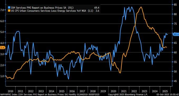 The September ISM Services report for 2025 provided a mixed picture for both the U.S. and world economies. Headline services activity flatlined at a PMI of 50, whereas a sub-index, Prices Paid, surged to a high of 69.4—its highest reading since early 2023. The change here shows ongoing inflationary momentum for the services component, a large and important sector of interest closely watched by the Fed. On a historical chart, there’s been a significant—far-from-excellent—correlation between ISM Services Prices Index and core CPI services inflation, for which it’s a leading directional indicator of policy thinking.
