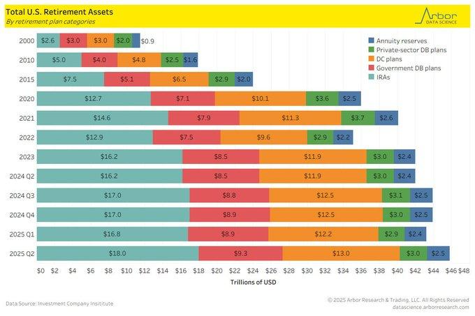 U.S. retirement assets totalled nearly $46 trillion in Q2 2025, having risen by a quarter-over-quarter 6%. Driven largely by successful returns on equity markets and stable contributions flows, market-based retirement wealth accumulation solidifies its growing dominance. Remarkably, Individual Retirement Accounts (IRAs) now constitute by far the largest proportion—roughly $18 trillion—over defined contribution programs and government-directed defined benefit programs. The division of assets documents a continuing structural realignment of retirement solutions towards individually administered retirement solutions as a result of shifting labor dynamics and investment trends.